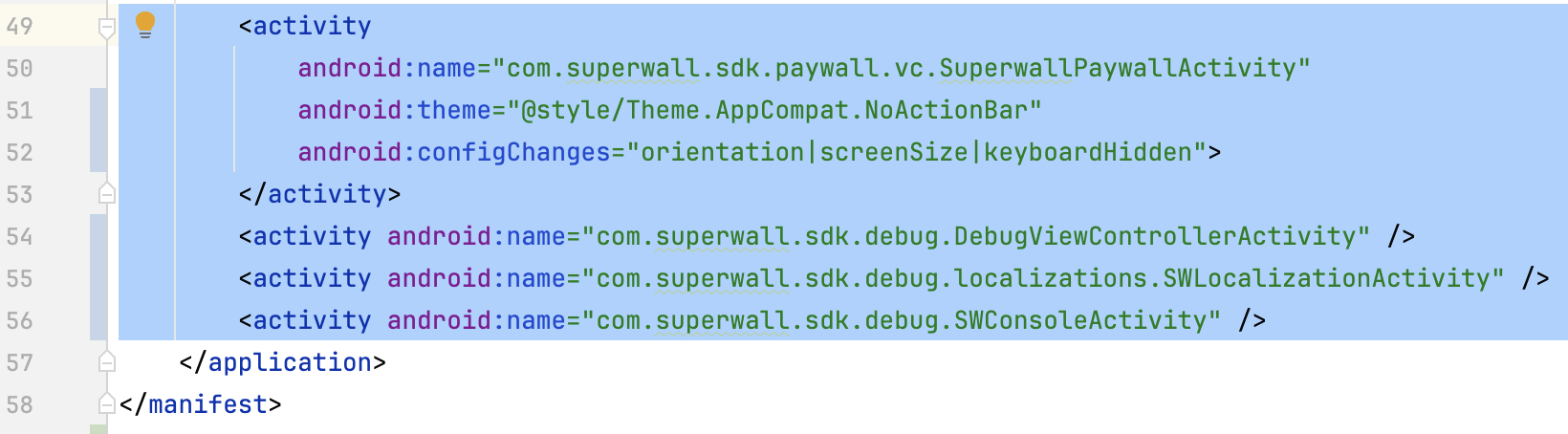 <activity android:name="com.superwall.sdk.debug.SWConsoleActivity" />Set your app's theme in the android:theme section.